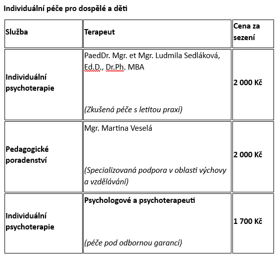 - Garantovaná kvalita: Celý tým pracuje pod vedením PaedDr. Mgr. et Mgr. Ludmily Sedlákové, zkušené psycholožky, pedagožky a psychoterapeutky s letitou praxí.